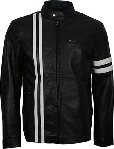 - Black Retro with White Stripes Genuine Leather Biker Jacket